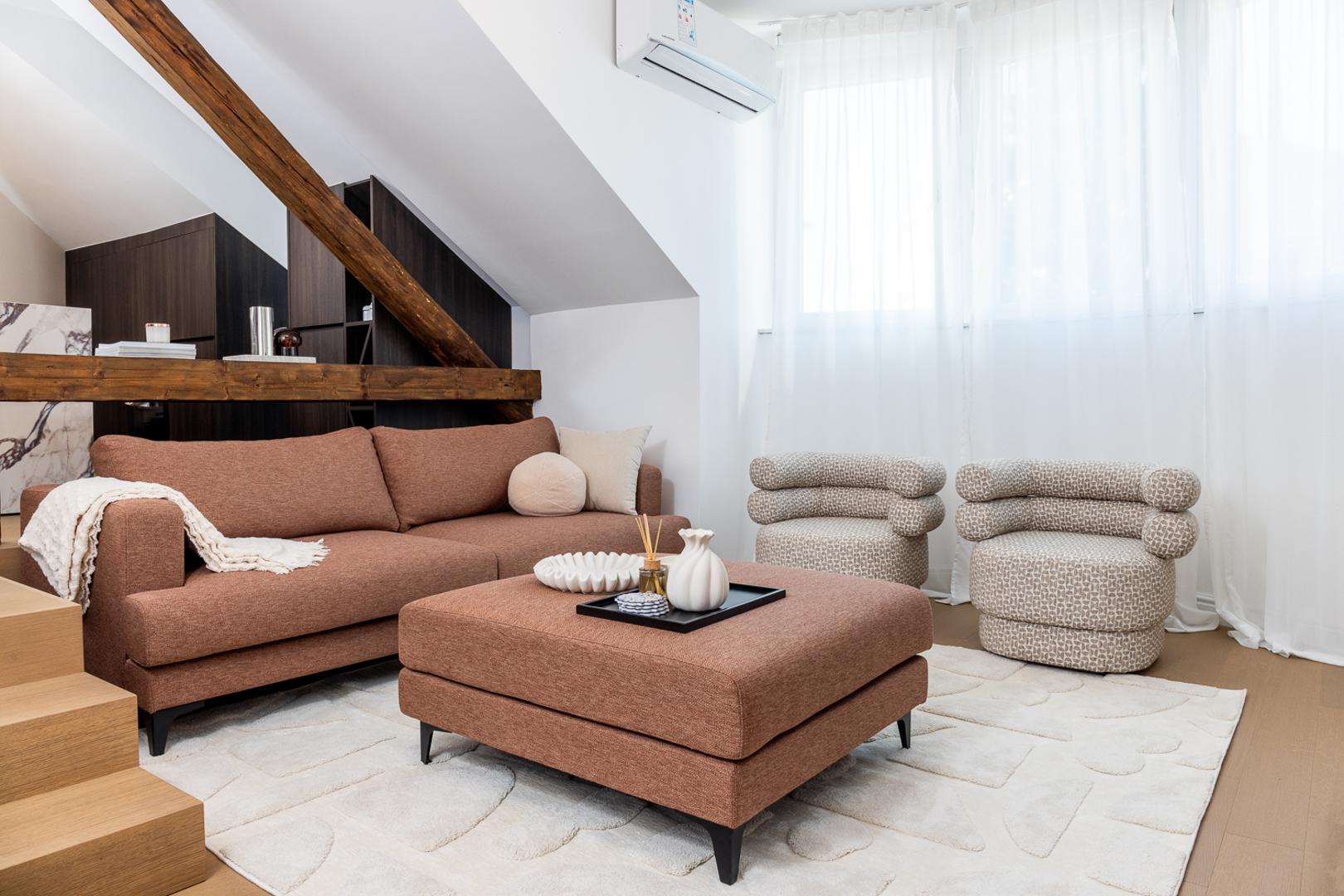 Cijelim stanom proteže se elegantan i svijetao stil s modernim linijama, ali i klasičnim dodirima – štukaturama, mramornim uzorcima, toplim bojama, kao i umjetnošću na zidu, ručno rađenom od gipsa.