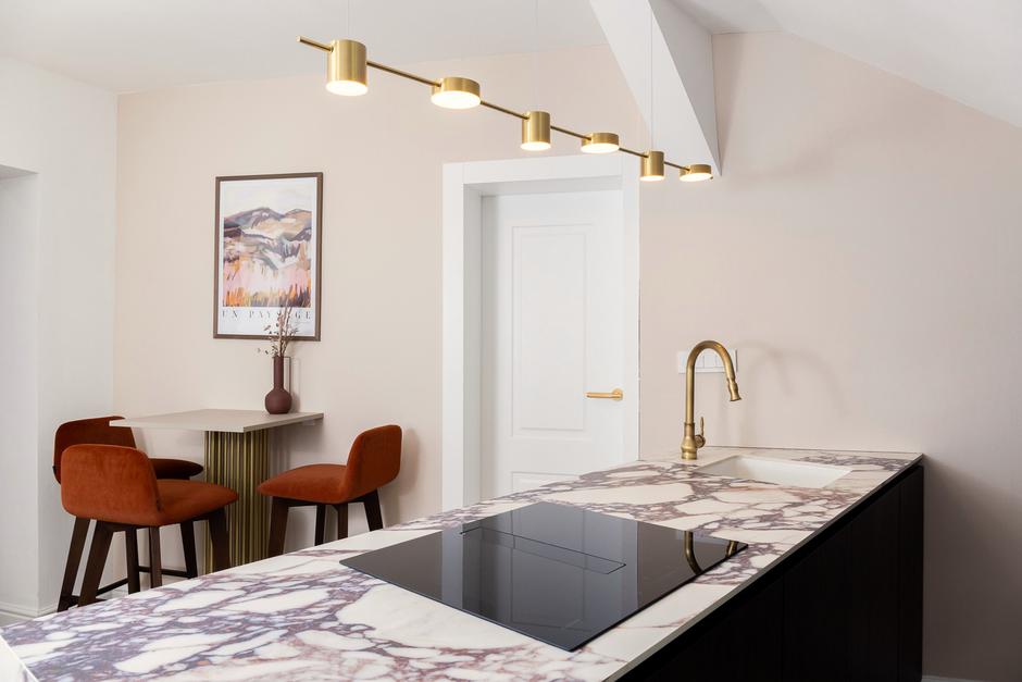 Highlight stana svakako je kuhinjski otok, o kojem je dugo maštala i koji joj je bio inspiracija u svim fazama uređenja. Izrađen je s Laminam radnom pločom u efektu mramora, koja se elegantno obavija oko cijelog otoka, stvarajući dojam luksuza i čistoće. Isti motiv mramora nastavlja se i u kupaonici, gdje je umivaonik rađen po mjeri od iste keramike kao i pločice u tušu. Sve je podignuto zlatnim detaljima – od slavina do okvira ogledala – koji prostoru daju dozu sofisticiranosti. Rezultat je interijer koji spaja toplinu starogradnje i suvremeni dizajn, prostor koji je istovremeno funkcionalan i osebujan, prožet svjetlošću, teksturama i osobnošću.