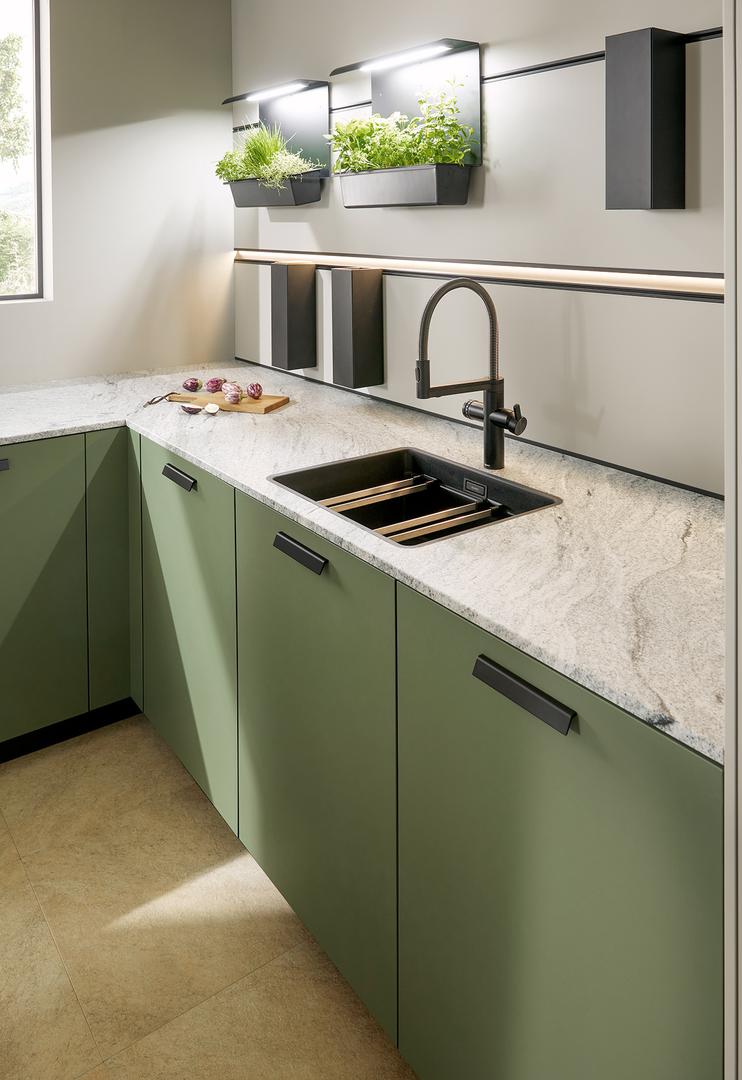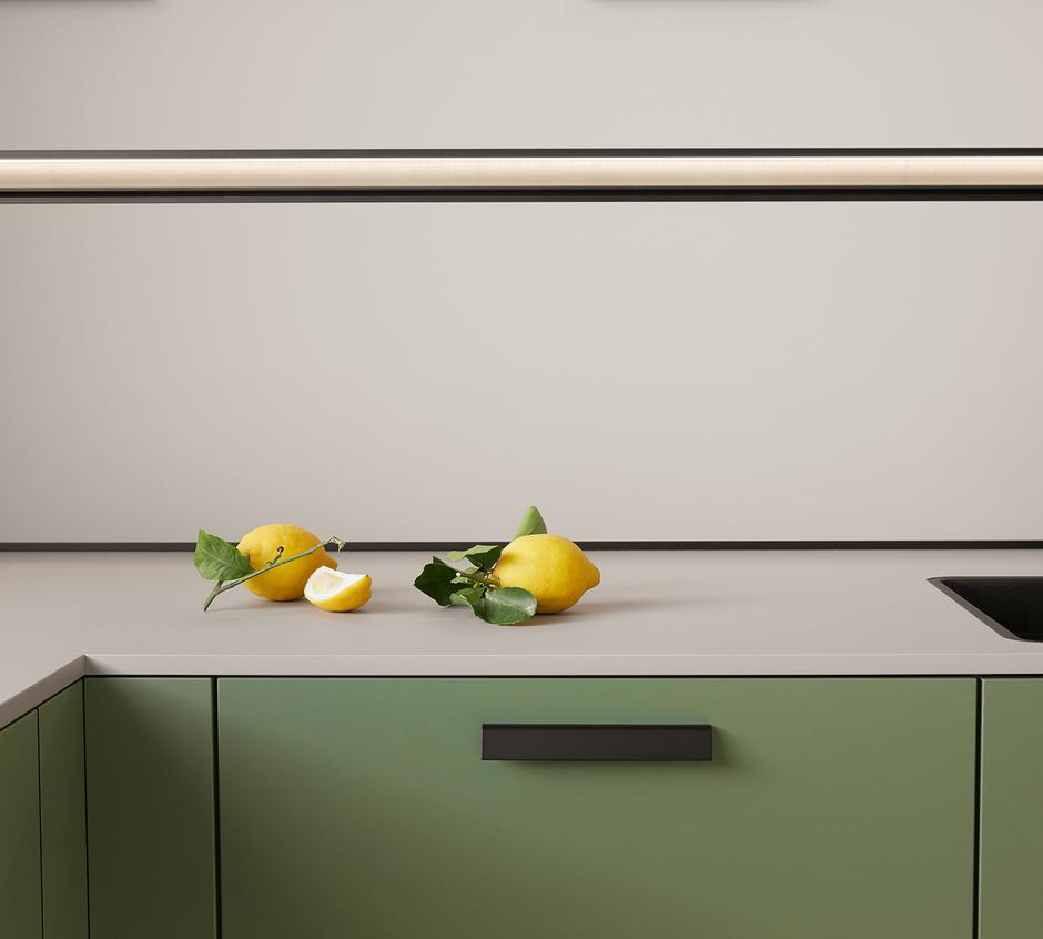 Svježina, spokoj i mediteranski šarm linoleumske fronte u maslinastoj zelenoj boji prenose mnoštvo pozitivnih impresija. U boji cafe rose, materijal zrači blagom elegancijom, a puderasti ton naglašava prirodnost. Izvanredan svilenkasti osjećaj pri dodiru materijala u kombinaciji s privlačnom estetikom mat prirodno sive boje osvojit će mnoge klasičare u osmišljavanju vlastite kulinarske oaze.