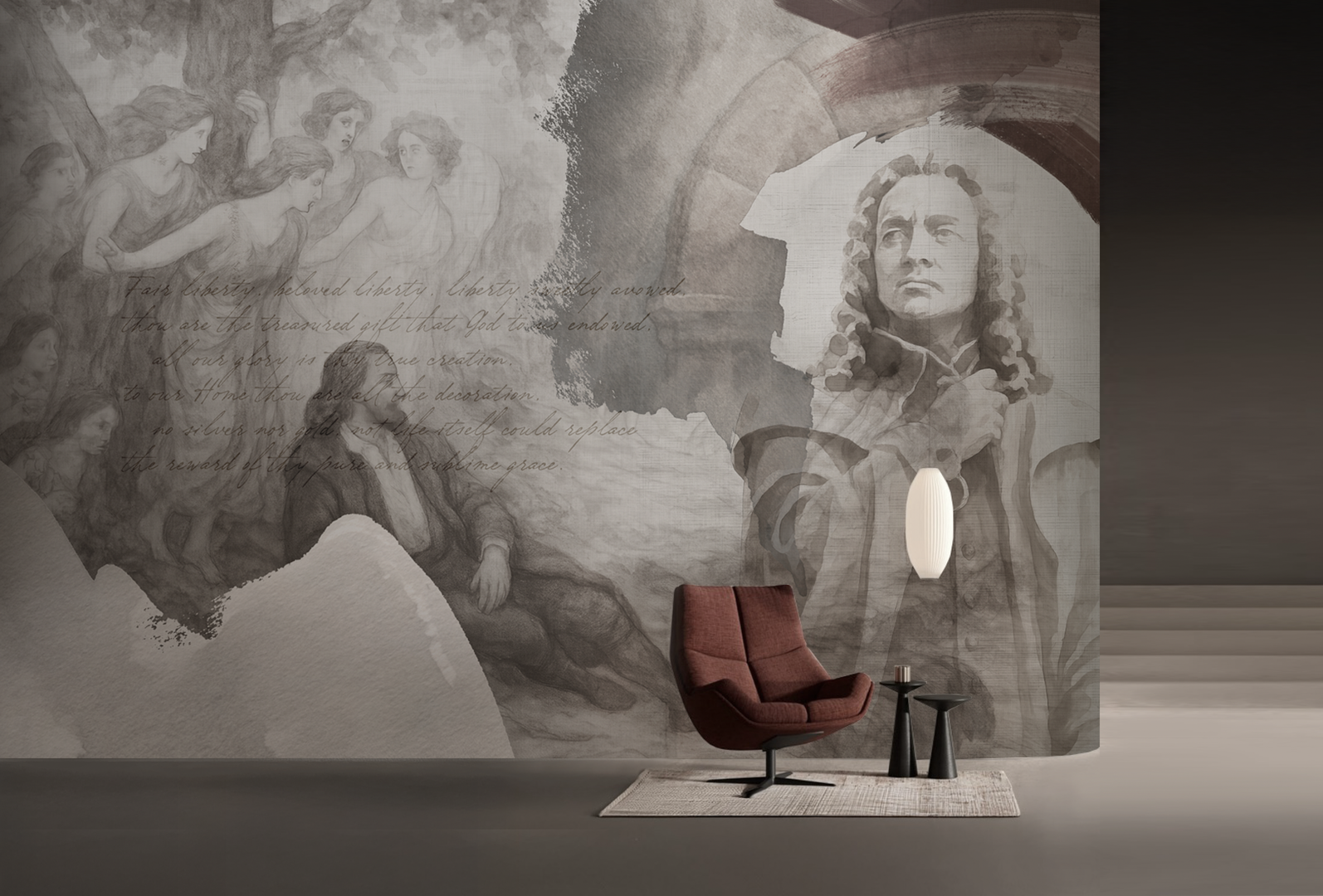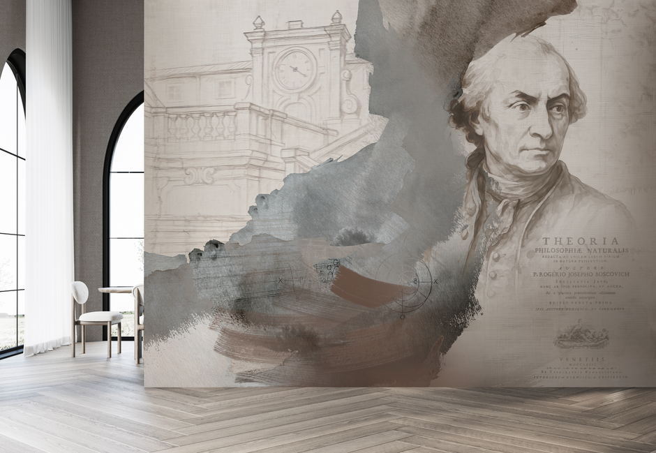 Svaka tapeta iz nove kolekcije nosi trostruku kompoziciju: figuru junaka priče, arhitektonski element koji ga smješta u prostor i povijesni dokument koji ga uranja u vrijeme. Redoslijed je pažljivo promišljen – figure dominiraju, arhitektura daje strukturu, a dokumenti pružaju tihu, ali ključnu pozadinsku priču. Izdaleka, kompozicija djeluje skladno; izbliza otkriva bogatstvo detalja – rukopisne zapise, zrnca pigmenta i teksturu papira. Glavni junaci kolekcije su dubrovački velikani: pjesnik Ivan Gundulić, znanstvenik i filozof Ruđer Bošković, renesansni liječnik Amatus Lusitanus... Tu su i bezimeni junaci – trgovci pod lukovima Sponze, pomorci s blagom iz dalekih luka, barjaktari sv. Vlaha, žene koje su djecu ostavljale pred vratima prihvatilišta znajući da će ondje pronaći sigurnost. Arhitektura u kolekciji djeluje kao stup narativa: Knežev dvor – političko srce Republike, palača Sponza – gospodarski centar, crkva sv. Vlaha – duhovno središte, te Onofrijev vodovod – inženjersko čudo 15. stoljeća. Pozadine tapeta ispisane su rukopisima i dokumentima koji su oblikovali Dubrovnik: statutom iz 1272., odlukama Velikog vijeća, receptima iz franjevačke ljekarne Male braće, starim kartama Republike, zapisima o trgovini, pomorstvu i ukidanju ropstva – stoljećima prije ostatka Europe.