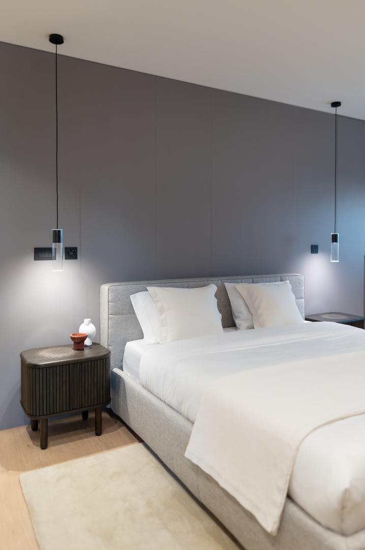 Glavna roditeljska spavaća soba od 17 kvadrata s garderobom i velikom kupaonicom pruža praktičnost i luksuz. Neutralni, svijetli tonovi s naglaskom na sivu stvaraju smiren ambijent, a središnje mjesto zauzima krevet. Usklađen komadni namještaj i dekoracije, stvaraju harmoniju i intimnu oazu za odmor.