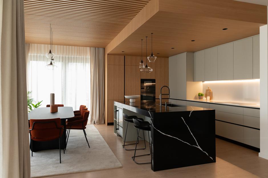 Dnevni boravak i blagovaonica smješteni su u prizemlju kuće i dio su otvorene dnevne zone koju čini i kuhinja. Veliki adut ovog open spacea je prirodno svjetlo koje omogućuje prozračnost i lako kretanje, dok tamne boje i detalji dolaze do izražaja. Zona je kombinacija minimalizma, elegancije i bezvremenskog dizajna, naglašena komadnim namještajem koji je unio dozu luksuza. Elegantna kutna garnitura, retro fotelje, crni klub stolić i dizajnerska rasvjeta čine prostor skladnim i karakterističnim.