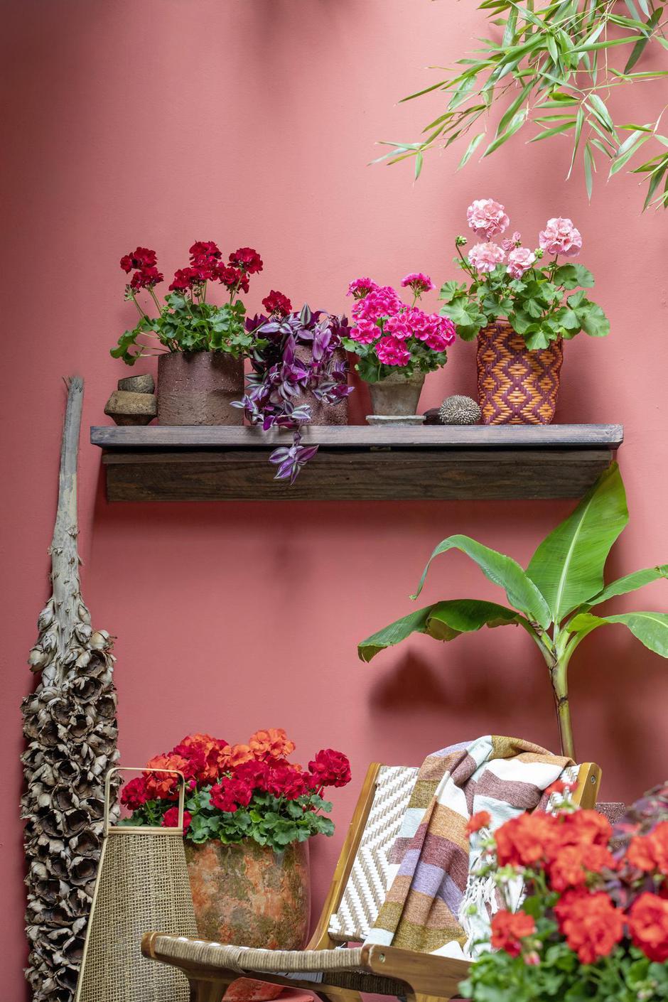 Urbana džungla sve je veći trend, i u interijeru i u eksterijeru. To i ne čudi – mnogo ljudi traži svoju prirodnu oazu u svakidašnjem ubrzanom životu. Na terasi na slici, pelargonije blagih boja u kontrastu su s bujnim zelenim biljkama i daju lagodan, opuštajući osjećaj. Nježni rumeni tonovi zidova dodaju toplom kućnom ugođaju. Imajte na umu da pelargonijama treba puno sunca. Idealno mjesto za pelargoniju je sunčano ili djelomično sjenovito.